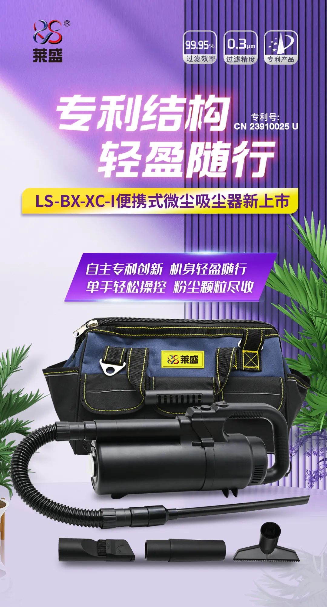 萊盛便攜式微塵吸塵器,專為通用耗材行業(yè)量身定制,只為吸附碳粉而生。型號 LS-BX-XC-I。自有專利結(jié)構(gòu),專利號 CN 23910025 U。輕盈隨身攜帶,單手輕松操作。機(jī)身凈重僅1.35kg≈兩瓶半500ml礦泉水。各處縫隙死角,碳粉灰塵一掃而空。塵氣分離技術(shù)、有效過濾 > 0.3微米直徑廢粉。過濾效率 > 99.95%。隨機(jī)附贈萊盛便攜收納包。內(nèi)置多種吸嘴,從容面對多類工作場景。訂購咨詢:010-82490136 轉(zhuǎn) 605——萊盛光標(biāo)服務(wù)事業(yè)部
